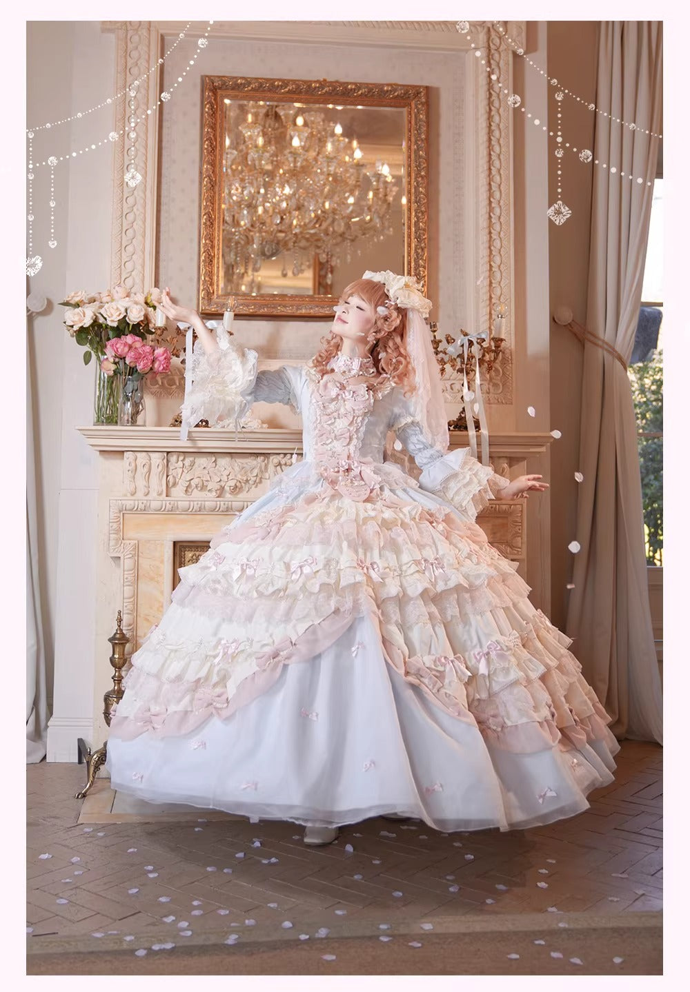 リボンヴェールセット・ロング丈:ワンピース、インナースカート、つけ袖、リボンヴェール、ネックレス、エシャルプ