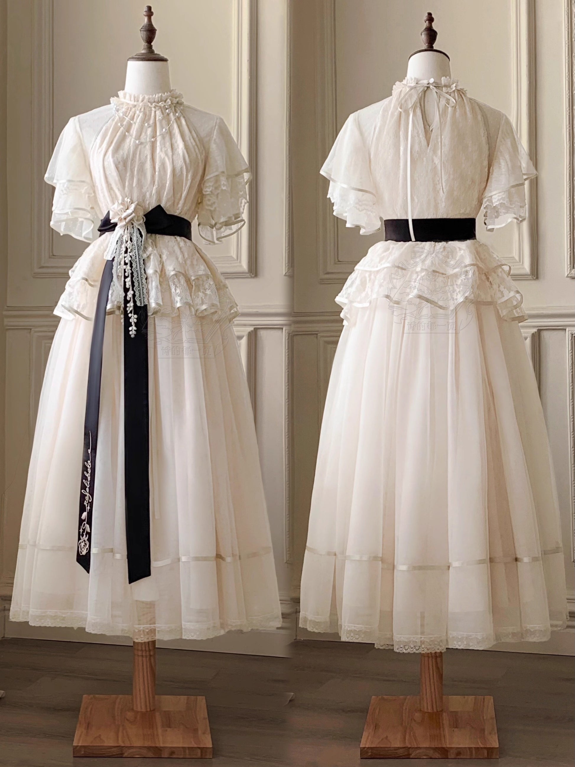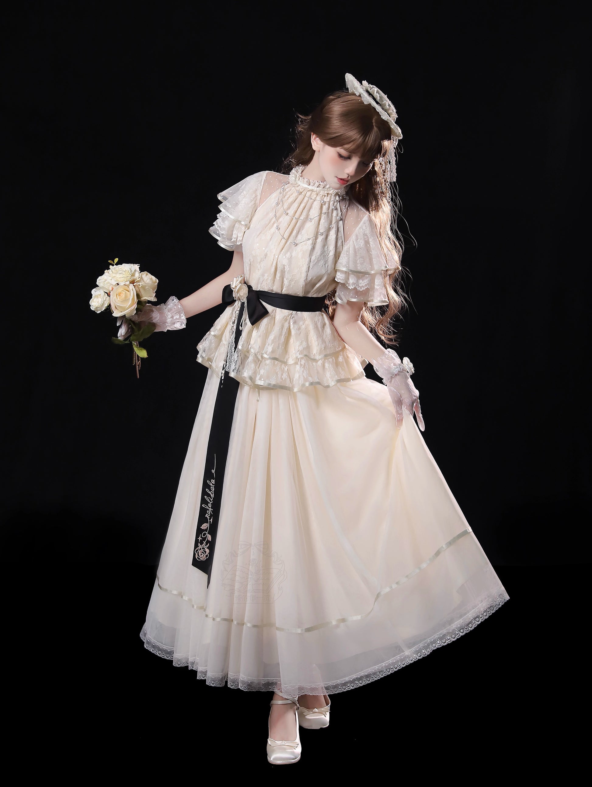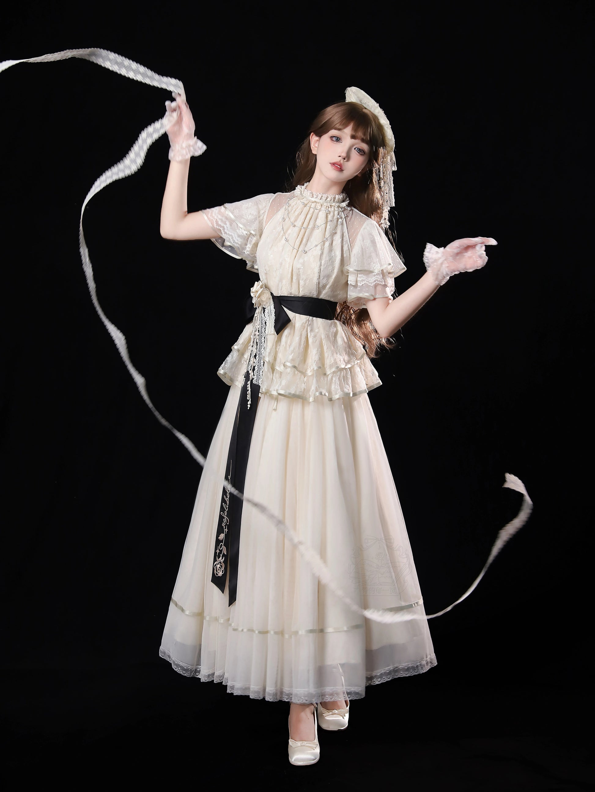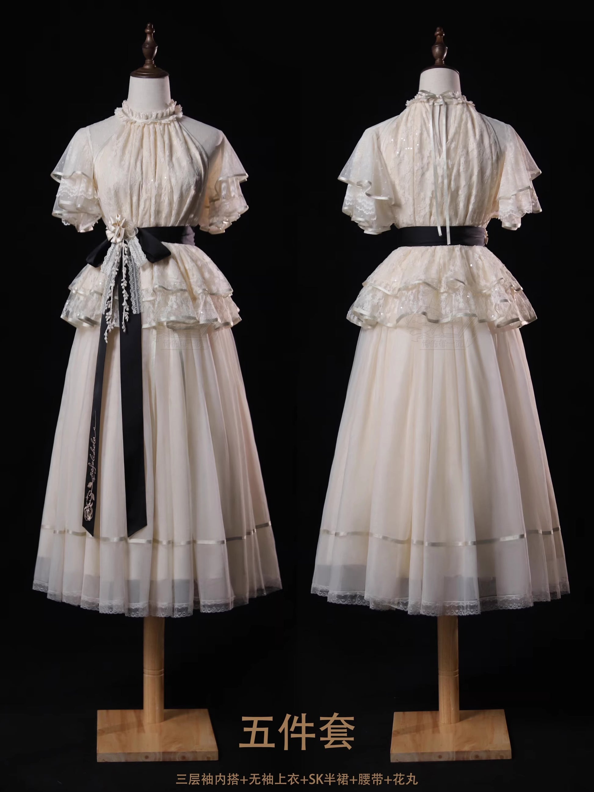 ※5点セット→フリル袖インナー、トップス、スカート、ベルト、花飾り